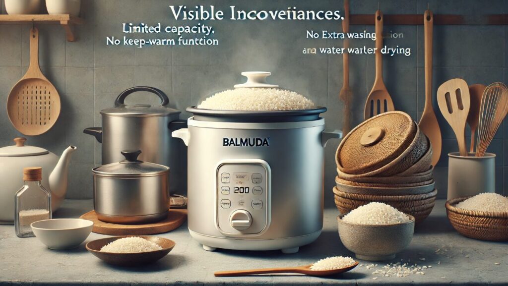 しかし、口コミからはデメリットも見えてきます。主に「保温ができない」「容量が3合まで」「手入れが増える」といった点です。例えば、家族が多い家庭では容量不足を感じやすく、まとめて5合や1升を炊きたい人には不向きだと考えられます。また、保温がないため仕事や学校で帰宅時間がバラバラの家庭では不便さが目立ちます。炊き立てをすぐ食べられない場合は、冷凍保存や温め直しを工夫する必要があります。さらに、外釜に水を入れて使う構造上、毎回お湯を捨てて乾燥させる手間が増えますし、内釜や外釜をしっかり洗わないとカビや臭いが残るリスクもあります。例えば、「洗い物が増えて面倒」「保温がなくて食べたいときにご飯がない」といった声が挙げられています。単純にデザイン性やブランド力だけで選ぶと後悔する可能性があるため、こうした使用上の制約を理解しておくことが重要です。